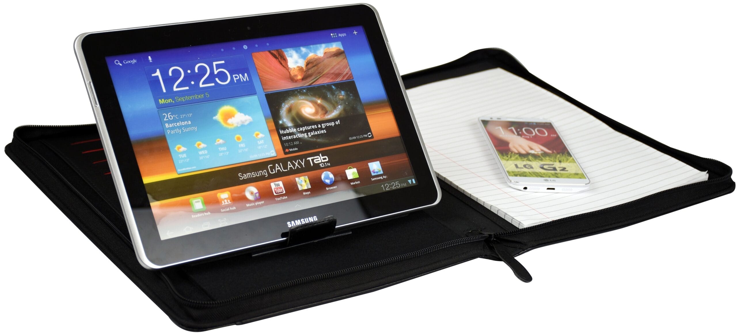 Der integrierte Tablet-Ständer ermöglicht es Ihnen, mobil zu arbeiten und zu präsentieren. Egal, ob Sie in einem Café, im Zug oder im Büro sind, mit der FOLIO Schreibmappe haben Sie Ihr mobiles Büro immer dabei. Arbeiten Sie effizient und professionell – überall und jederzeit.