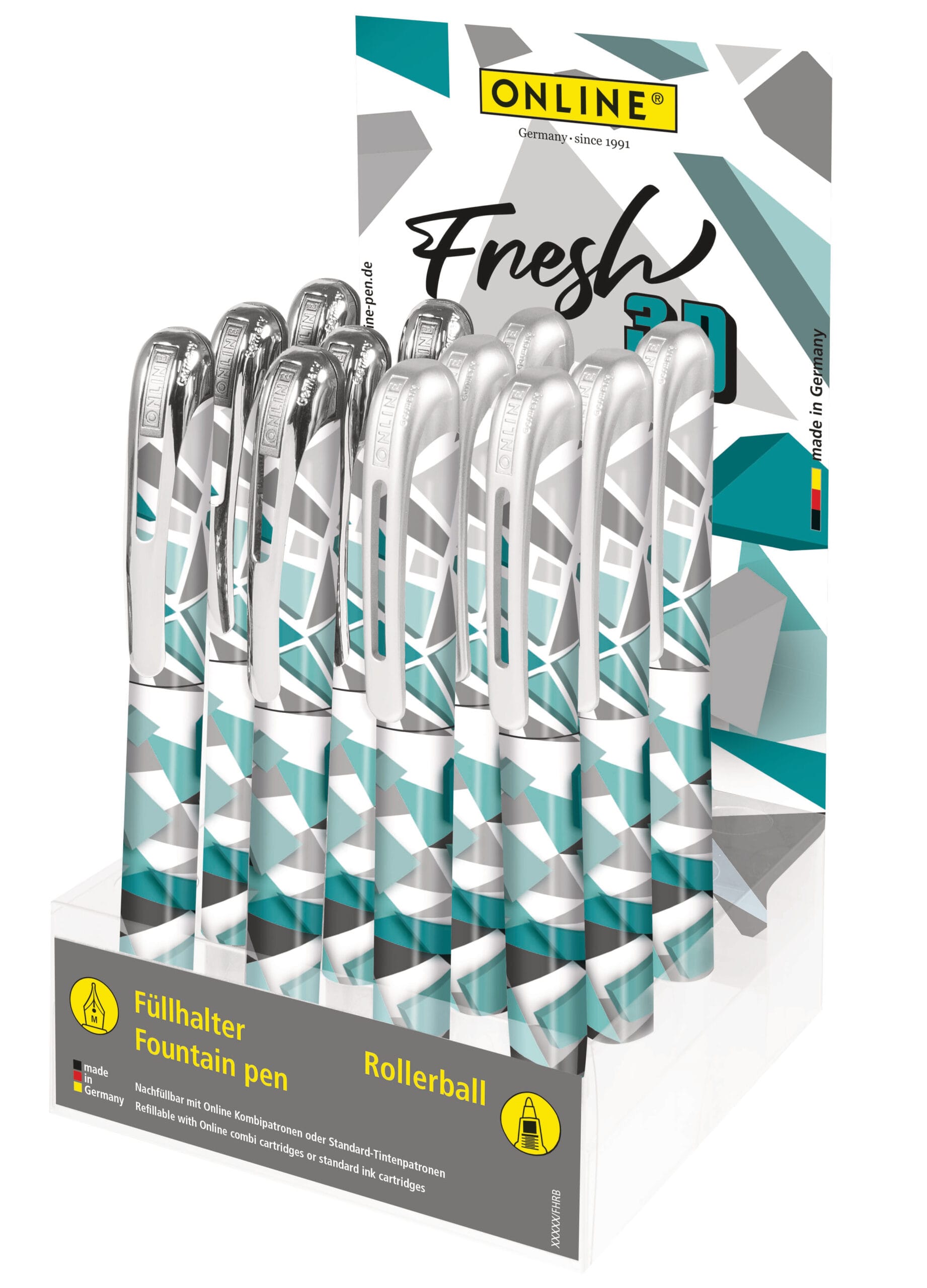 Entdecken Sie das Lifestyle-Schreibgerät FRESH.3D mit einem beliebten Rollerball-Schreibsystem, das in puncto Qualität und Langlebigkeit Massstäbe setzt. Die verbesserte Magic Ball sorgt für ein noch geschmeidigeres Schreibgefühl. Das ergonomische Softtouch-Griffstück unterstützt die Handhaltung und ermöglicht ein entspanntes Schreiberlebnis, besonders auch für Linkshänder. Das Schreibgerät ist nachfüllbar mit ONLINE Kombipatronen oder Standard-Tintenpatronen. Sollte das Griffstück mit Magic Ball einmal ersetzt werden müssen, ist dies als Ersatzteil erhältlich. Jedes Stück durchläuft eine Qualitätsprüfung und wird in Deutschland hergestellt. Das Display enthält 12 Stück des FRESH.3D Schreibgeräts.
