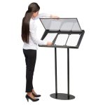Insgesamt ist dieser moderne schwarze Speisekartenständer eine ideale Wahl für Restaurants, Cafés, Bars und andere Geschäfte, die eine attraktive Präsentation von Menüs oder Informationen im Freien benötigen. Mit seinen strapazierfähigen Materialien, der pulverbeschichteten Basis und der praktischen Nutzbarkeit ist dieser Ständer ein unverzichtbares Accessoire, das Funktionalität und Ästhetik harmonisch vereint.