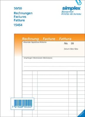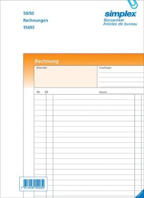 Möchten Sie Ihren Rechnungsprozess effizienter gestalten? Die SIMPLEX Rechnungen sind die optimale Lösung! Diese Rechnungen bestehen aus orangefarbenen Seiten, die über eine zusätzliche weisse Kopie verfügen. Auf diese Weise erhalten Sie nicht nur das Originaldokument, sondern auch eine Kopie für Ihre Unterlagen.