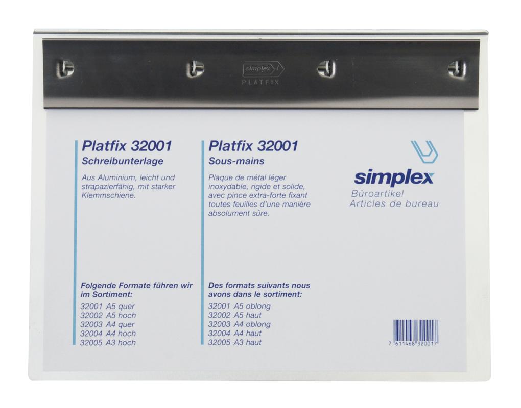 Die SIMPLEX Schreibplatte Platfix 32004 aus Aluminium ist mehr als nur eine einfache Schreibunterlage. Sie vereint Funktionalität, Eleganz und Langlebigkeit in einem Produkt. Ob im Büro, in der Schule oder Zuhause – mit dieser Schreibplatte sind Sie stets bestens ausgestattet, um Ihre Gedanken und Ideen festzuhalten. Investieren Sie in ein Produkt, das Ihnen sowohl in der täglichen Arbeit als auch in kreativen Momenten treue Dienste leisten wird.
