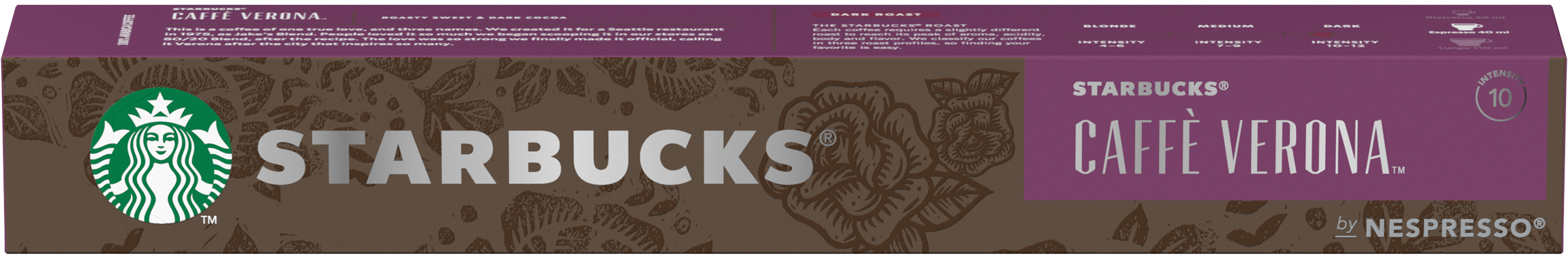 Die STARBUCKS Kaffeekapseln Caffè Verona bieten Ihnen ein erstklassiges Kaffeegenuss-Erlebnis in der Komfortzone Ihres eigenen Zuhauses. Ob für einen schnellen Kaffee am Morgen oder eine entspannende Tasse am Abend – mit dieser Auswahl an Kaffeekapseln sind Sie bestens ausgestattet. Gönnen Sie sich eine Auszeit und geniessen Sie den unverwechselbaren Geschmack von STARBUCKS!