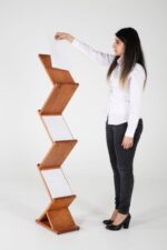 Der Prospektständer Wood Zick Zack vereint stilvolle Eleganz und funktionales Design. Die Möglichkeit, von vorne und hinten bestückt zu werden, steigert die Sichtbarkeit Ihrer Informationen. Mit hochwertigem Buchenholz und kompakten Maßen stellt dieser Prospektständer die perfekte Wahl dar, um Ihre Inhalte auf stilvolle und wirkungsvolle Weise zu präsentieren.